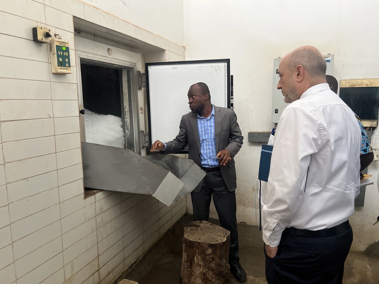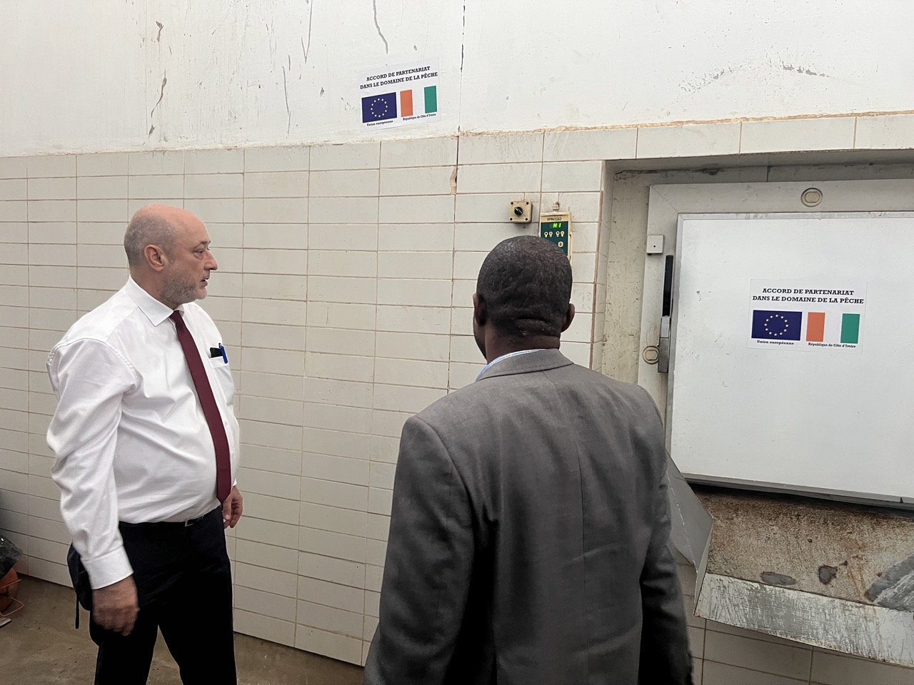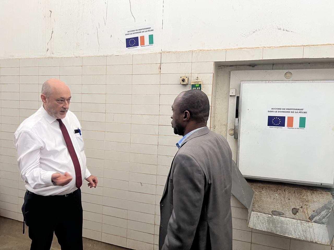 Pendant plus de 48 heures, Monsieur Alain HOUYOUX appuyé de Monsieur KI-ZERBO Olivier, Chargé de projets à la délégation de l’Union européenne à Abidjan, ont échangé avec le Conseiller Technique pêche Colonel KODJO Alain, le Coordonnateur du PAGDRH Monsieur TOURE Adama entouré de ses Chefs de département et les représentants des Directions de la pêche et de l’aquaculture sur la finalisation du projet de matrice pluriannuelle à soumettre à la prochaine commission mixte. À la fin de sa mission, Il a visité le débarcadère Mohammed VI de Locodjro (Point de Débarquement Aménagé) pour constater l’effectivité de la réhabilitation de l’unité de production de glace qui est l’une des réalisations de l’appui sectoriel.