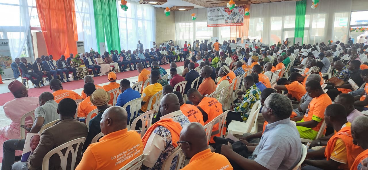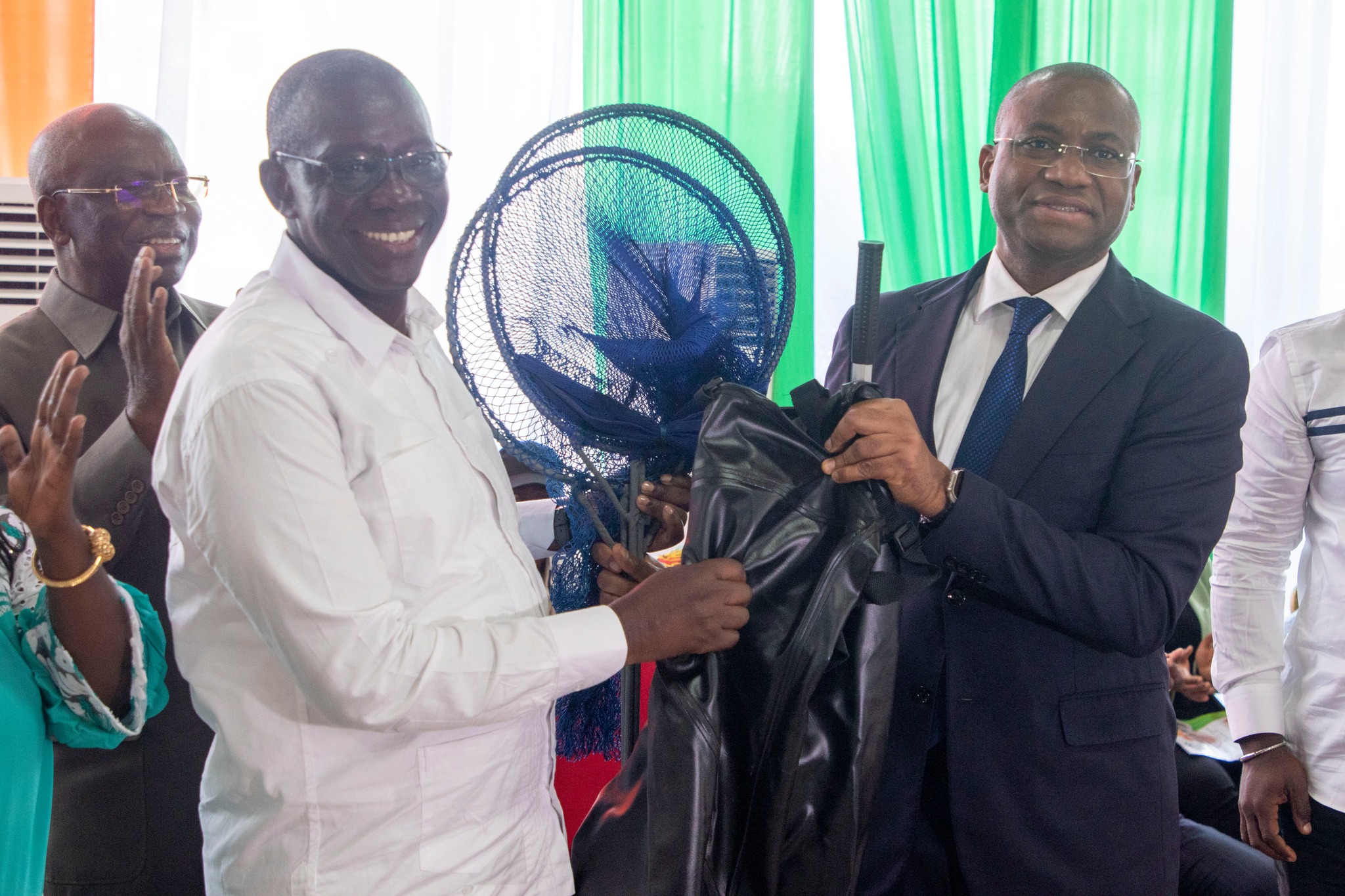 Avant la clôture de la cérémonie, le Ministre Sidi Tiémoko TOURE a remis un important lot d’équipement à l’interprofession de la filière aquacole (INTERAQUA). Profitant de cette remise de matériel, le Coordonnateur du Programme d’Appui à la Gestion Durable des Ressources Halieutiques (PAGDRH), Monsieur TOURE Adama, a rappelé à l’assistance que le MIRAH a accompagné l’INTERPÊCHE et l’INTERAQUA à travers le PAGDRH à hauteur de 93,4 millions de Franc CFA pour l’année 2024 :